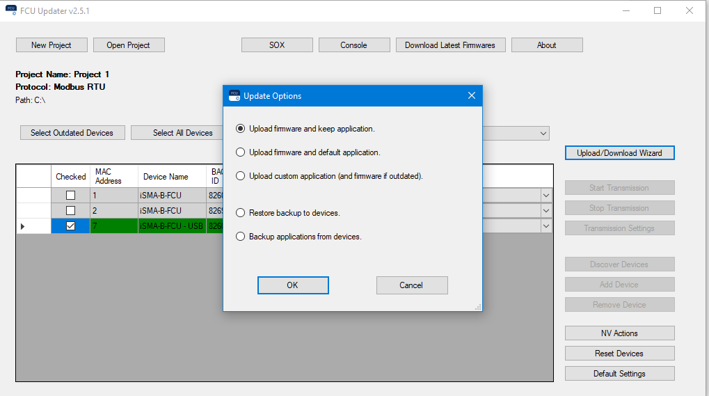Upload firmware and default application: firmware, kits and default application are uploaded. The present application on the device is overridden. This option uploads the newest version of the default application together with the newest firmware (*) available on the iSMA CONTROLLI It is recommended to use this option if the user does not have the custom application. System recompiles the downloaded application with the newest firmware, and if successful, it uploads the firmware and the default application to the device.
