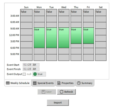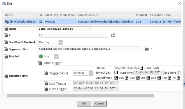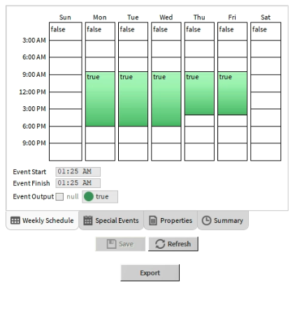 A Supervisor Schedule can exist anywhere on the station and when linked to the Time schedule export will write any changes to the schedule to the Trend controller. Note that this schedule may not reflect the actual schedule within the controller as changes can be made to the Trend schedule via SET and the web browser that will not be shown on this schedule. This Supervisor schedule is write only.