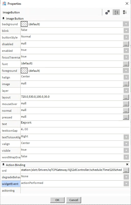 - For the Action Binding ‘ord’ field enter the path to the Iq3 Schedule Export Ext