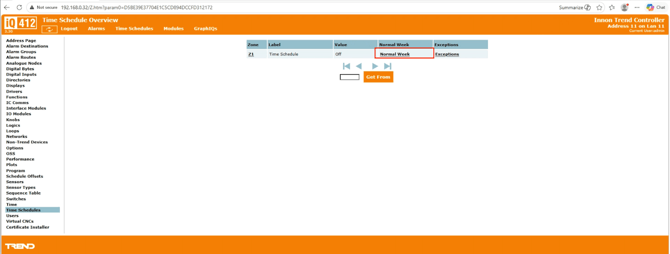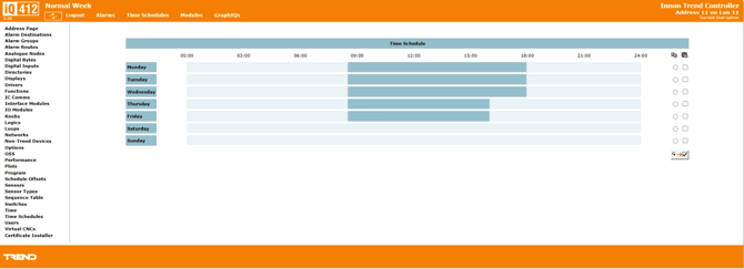 You can check that the schedules are being imported and exported correctly through the Trend controller web interface, Time Schedule page and clicking the “Normal Week” Link.