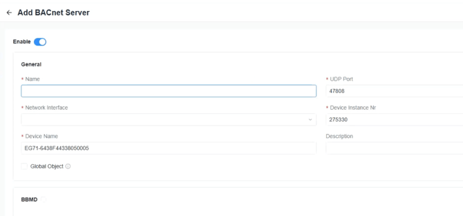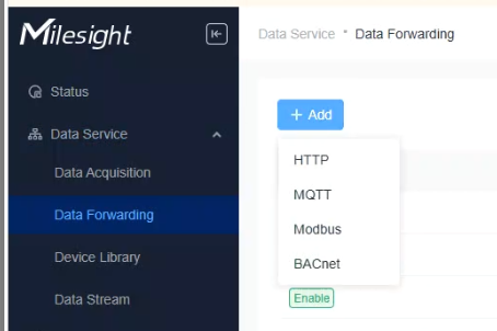 To enable and utilise the built in BACnet server on the EG71 you will need to head to Home > Data Service > Data Forwarding > Add > BACnet